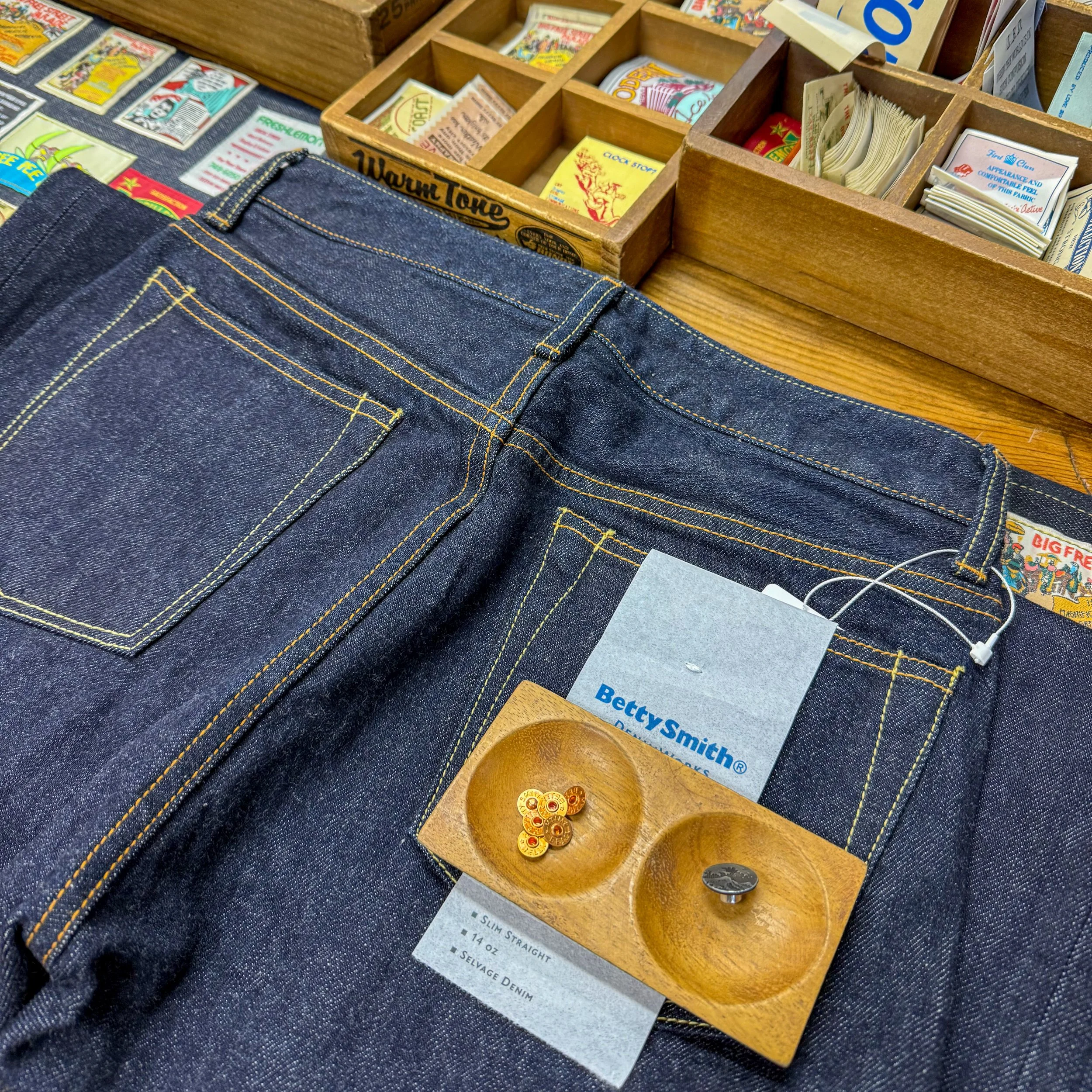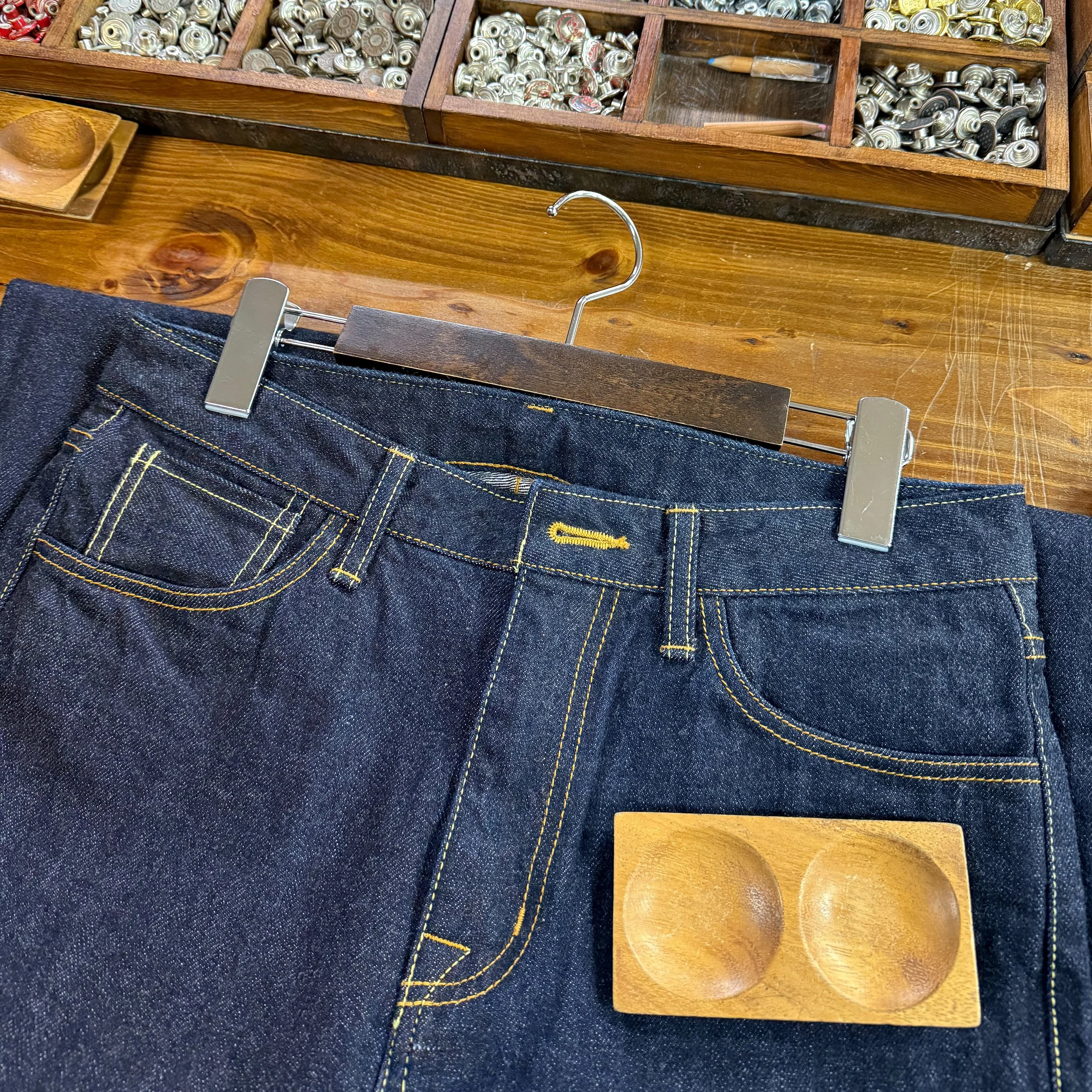 Japan is well known for their denim, and we decided to take advantage of that with a jeans customization workshop at the Betty Smith studio. We chose the workshop rather than fully customized jeans because we wanted to take our jeans with us rather than wait for completion and shipping. We had a lovely, quiet evening with just the two employees and ourselves in the studio. We were greeted warmly and introduced to our jean options, given some time to browse and try on the styles and sizes. With this workshop option, they provide hemming but no other alterations. Then came the hard part, choosing our hardware and patch. There were so many options for the button and rivets, making it hard to choose! I ultimately wanted something that felt unique and significant to the trip, and chose the button with the “Great Wave off Kanagawa” on it and gold-coloured rivets that popped against the indigo denim. The final choice, the most difficult one, was the patch for the back of the jeans. Again, I wanted something that would really tie into the workshop itself, so I knew I wanted to choose an option that incorporated the Betty Jean name. I landed on a beautiful leather patch that did exactly what I wanted. Finally, we were guided through attaching the button and the rivets ourselves! The foot pedal for attaching the components was harder to press than you’d expect! I was thrilled with the final result and getting to be involved with the creation of my own, individualized pairs of jeans, so satisfying!